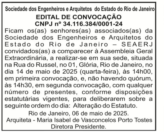 A SEAERJ convoca seus associados para Assembleia com o objetivo de debater e alterar o estatuto da entidade.
