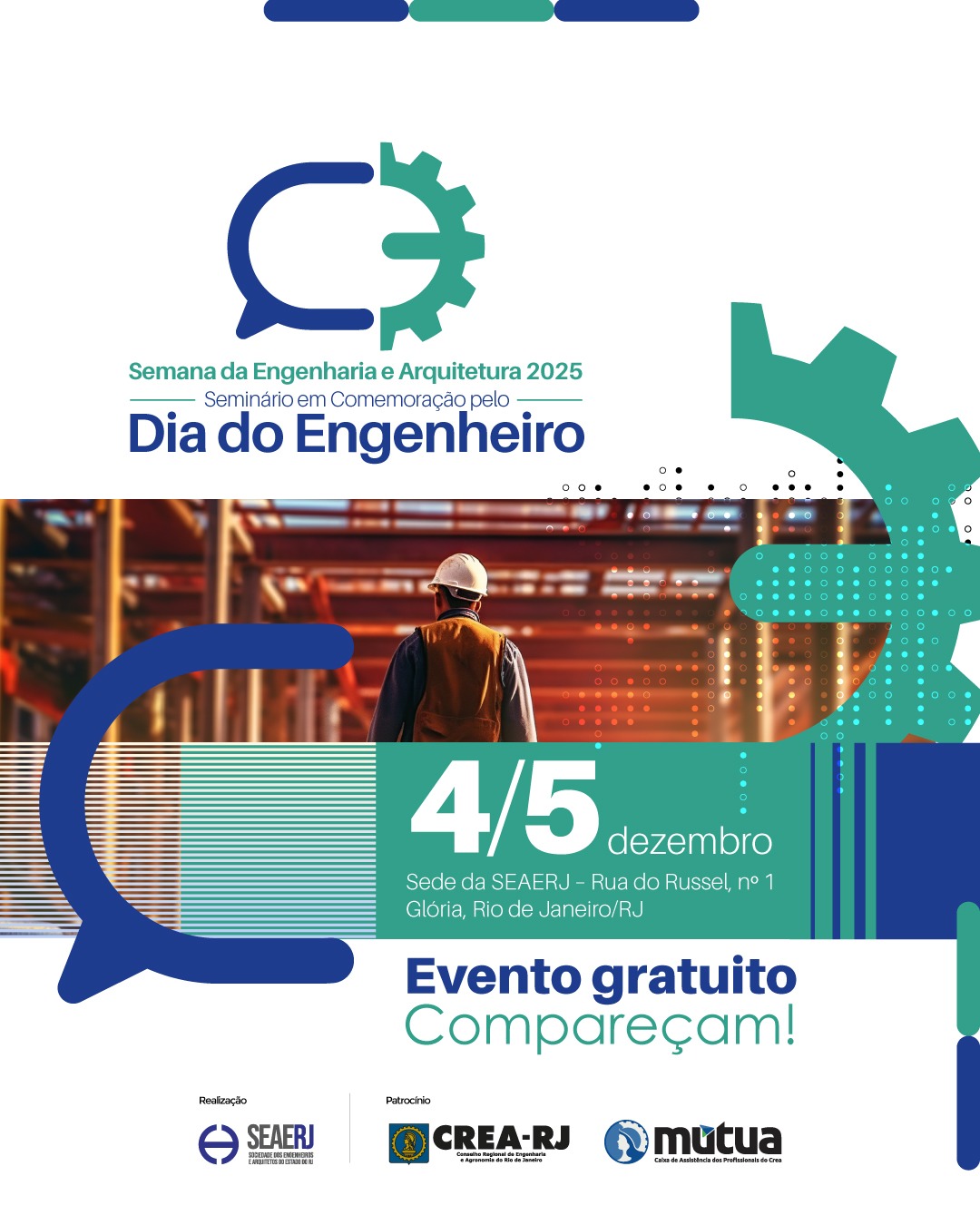 A Sociedade dos Engenheiros e Arquitetos do Estado do Rio de Janeiro (SEAERJ) realizará, entre os dias 4 e 5 de dezembro, a Semana da Engenharia e Arquitetura 2025, um seminário em comemoração ao Dia do Engenheiro. O evento reunirá profissionais, estudantes, gestores públicos e representantes de entidades de classe para debater temas relevantes relacionados à engenharia, arquitetura e urbanismo, com foco no fortalecimento da atuação pública nessas áreas.
